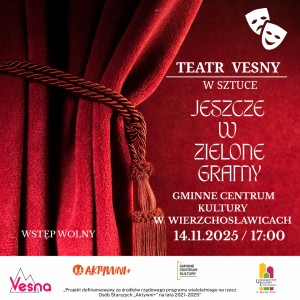 Z okazji Światowego Dnia Seniora serdecznie zapraszamy na wyjątkowy spektakl Teatru Vesny pt. „Jeszcze w zielone gramy”, który odbędzie się 14 listopada 2025 r. o godz. 17:00 w auli Gminnego Centrum Kultury w Wierzchosławicach.