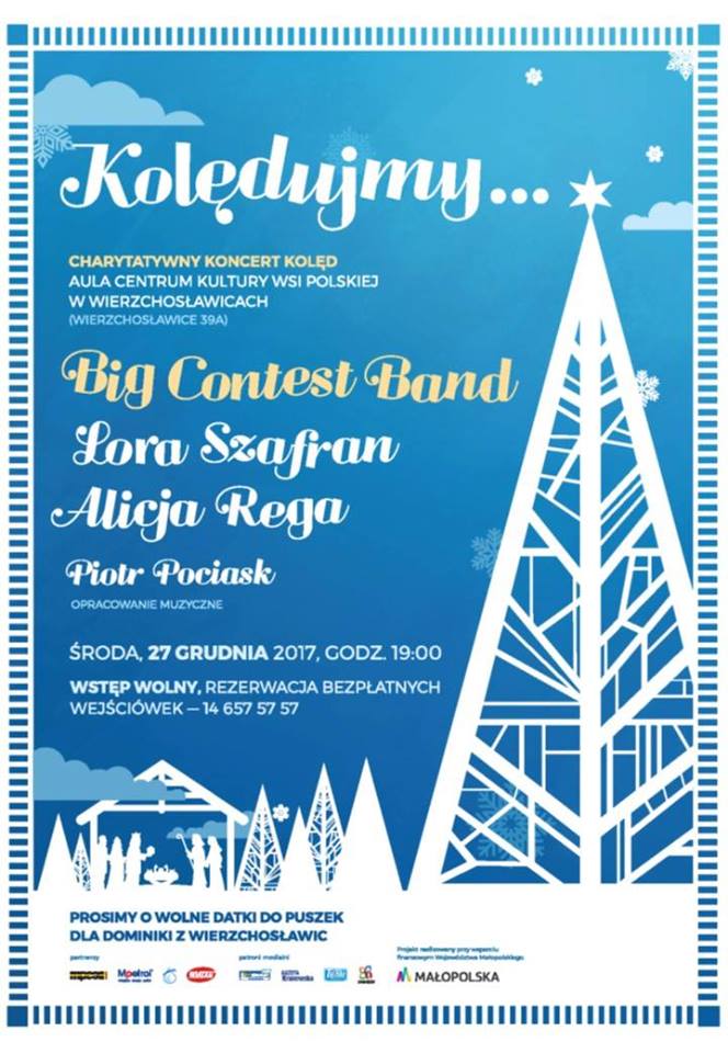 Wójt Gminy Wierzchosławice Zbigniew Drąg oraz Gminne Centrum w Wierzchosławicach zapraszają w najbliższą środę 27 grudnia 2017 r. o godzinie 19.00 do Centrum Kultury Wsi Polskiej, gdzie z charytatywnym koncertem kolęd zaprezentuje się tarnowski zespół Big Contest Band obchodzący jubileusz 10-lecia swojej działalności. Gościnnie wraz z orkiestrą wystąpią Lora Szafran – znakomita polska wokalistka jazzowa oraz Alicja Rega – finalistka tegorocznego konkursu Eurowizji Junior! Kolędy w jazzowych aranżacjach przygotowanych przez Piotra Pociaska będą prawdziwą muzyczną ucztą.