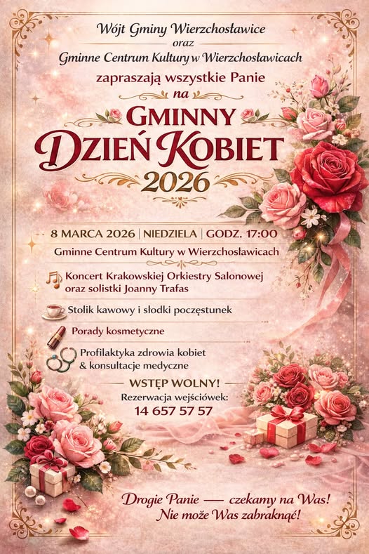 Wójt Gminy Wierzchosławice oraz Gminne Centrum Kultury w Wierzchosławicach serdecznie zapraszają wszystkie Panie na wyjątkowe wydarzenie z okazji Gminnego Dnia Kobiet 2026.