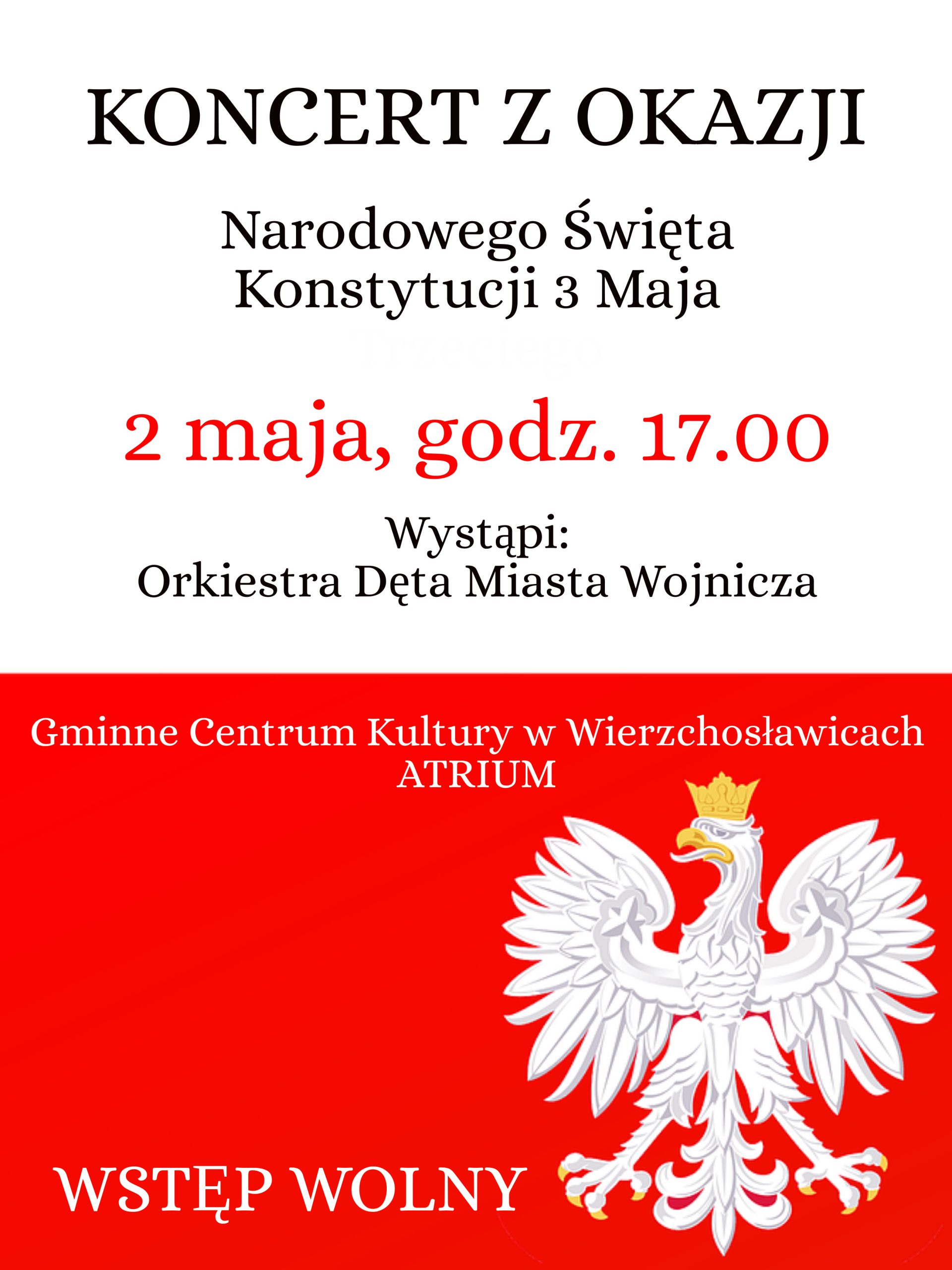 Gminne Centrum Kultury w Wierzchosławicach zaprasza na wyjątkowy koncert z okazji Święta Flagi Rzeczypospolitej Polskiej oraz Święta Konstytucji 3 Maja! Zagra zespół orkiestry dętej Miasta Wojnicza. W programie usłyszymy utwory patriotyczne, marsze oraz znane melodie w wyjątkowych aranżacjach.