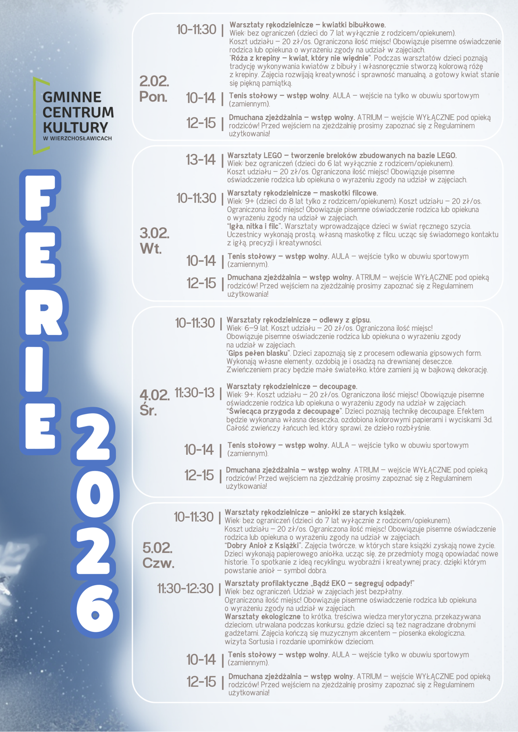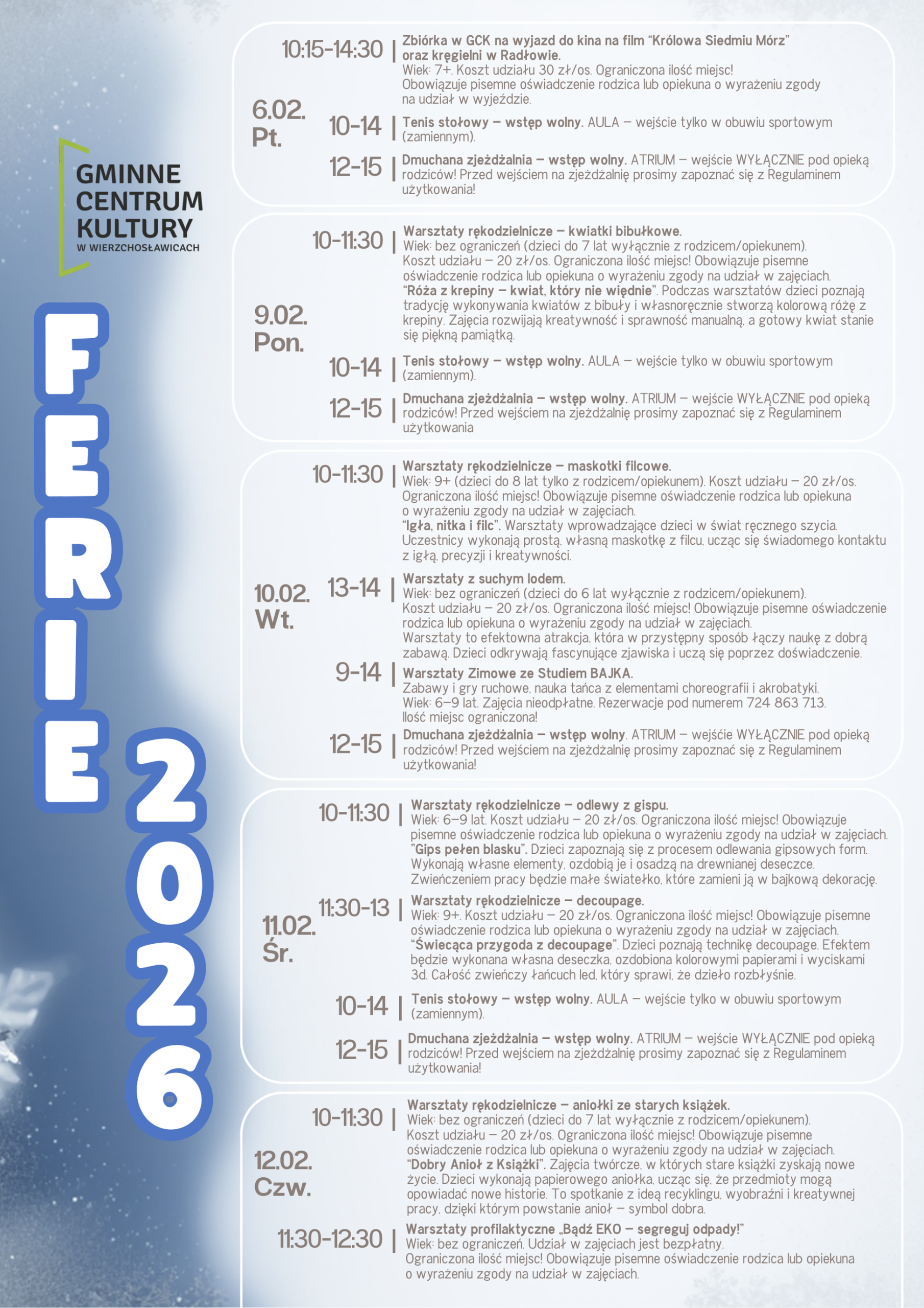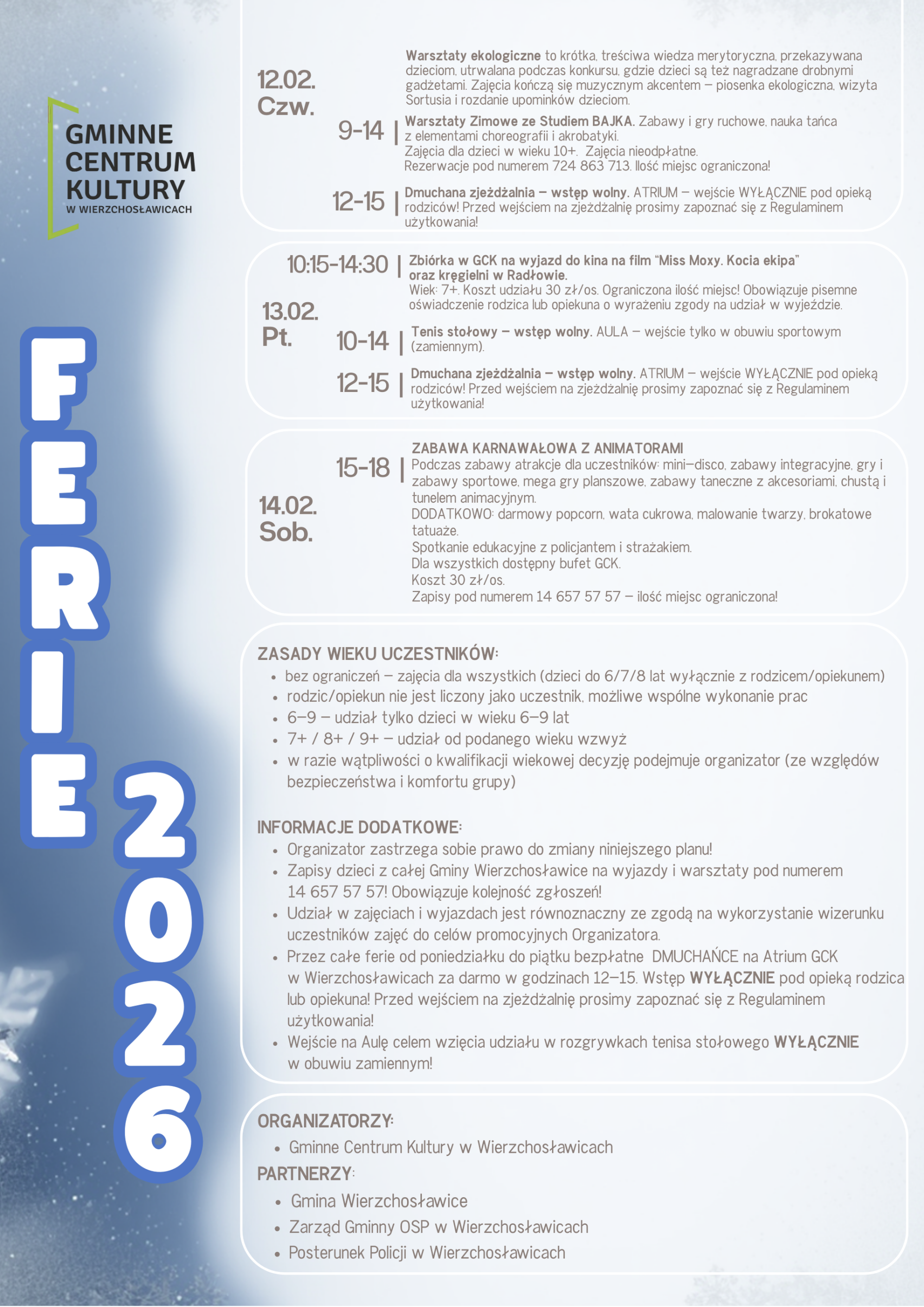 Gminne Centrum Kultury w Wierzchosławicach zaprasza dzieci i młodzież do udziału w zajęciach organizowanych w czasie ferii zimowych. Przygotowany program łączy kreatywną zabawę, aktywność ruchową oraz elementy edukacyjne, zapewniając atrakcyjną i wartościową formę spędzenia wolnego czasu.