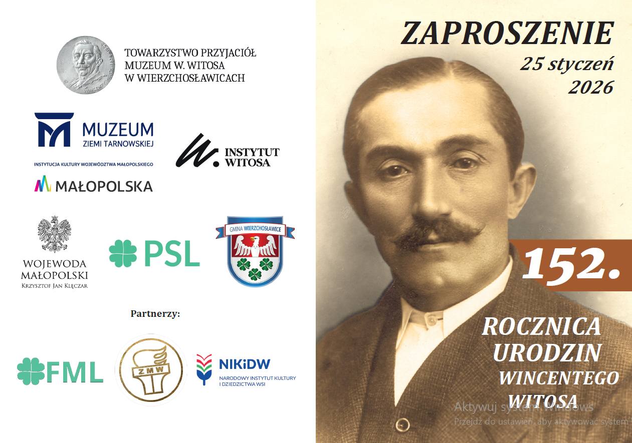Towarzystwo Przyjaciół Muzeum Wincentego Witosa w Wierzchosławicach, Rodzina Wincentego Witosa, Polskie Stronnictwo Ludowe, Wojewoda Małopolski, Instytut Wincentego Witosa, Wójt Gminy Wierzchosławice oraz Muzeum Wincentego Witosa w Wierzchosławicach – Oddział Muzeum Ziemi Tarnowskiej – mają zaszczyt zaprosić mieszkańców oraz gości na uroczystości upamiętniające 152. rocznicę urodzin Wincentego Witosa, które odbędą się 25 stycznia 2026 roku w Wierzchosławicach.